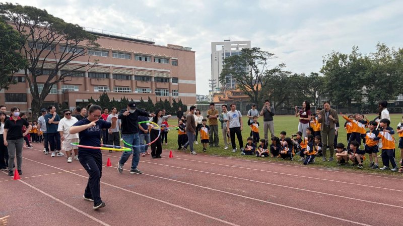 趣味競賽隨後登場,巧妙結合教育意涵與運動樂趣,現場笑聲不斷。其中親師共同組隊的「青春活力挑戰賽—呼拉圈折返跑」,成為焦點之一,參賽者在三角錐間穿梭前進,手中的呼拉圈象徵圓滿與包容,寓意親師合作無間,共同為孩子築起成長的守護圈。