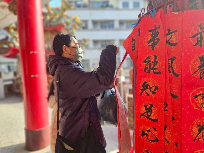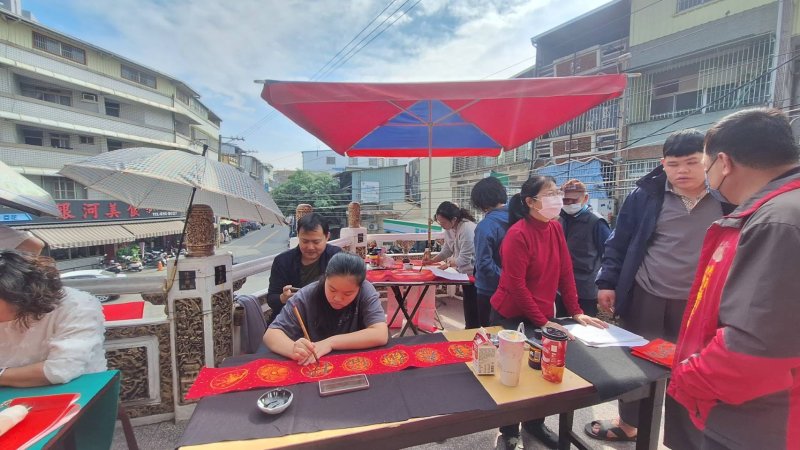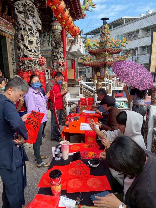 師生昨(24)日一早抵達威靈寺前佈置書桌與紅紙,隨著毛筆沾墨落紙,一副副春聯逐漸成形,學生們親手將作品遞到民眾手中,向長輩道賀、向鄉親送福。廟口人潮絡繹不絕,不少民眾排隊等候,也有人駐足欣賞運筆身影,年節氣氛在紅紙與墨香間緩緩鋪展。