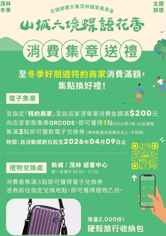 活動期間,遊客至指定特約店家單筆消費滿200元即可獲1點,消費滿400元可獲2點,以此類推;集滿3點即可持電子集章紀錄,前往新威遊客中心或茂林遊客中心免費兌換「活動限定收納包」乙份,限量2,000份送完為止。