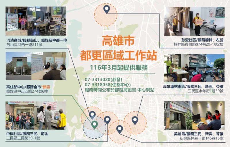 除了線上學習,實體諮詢服務也同步擴大。都發局將於3月啟用第六處區域型工作站,由高雄市住宅及都市更新中心營運,除原有週間下午時段外,首度加開每週三晚間6點至8點夜間諮詢,搭配既有五處假日工作站,形成更完整的服務網絡,提供上班族與不同族群更多彈性選擇。