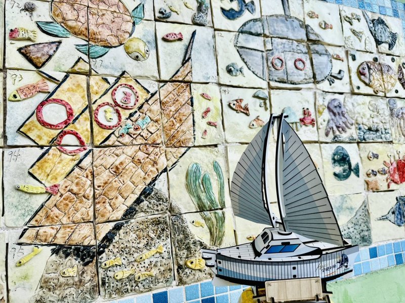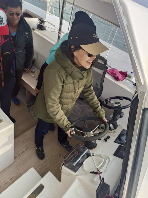 課程也融入在地文化,安排「食魚教育」體驗,品嚐東港飯湯,讓教師從飲食文化理解漁村生活脈絡,思考如何將地方知識轉化為教學素材。午後團隊移師大鵬灣濱灣碼頭,搭乘雙體帆船「安捷利納號」出航,將上午手作的船舶知識延伸至真實海域,展開一場行動中的海上教室。