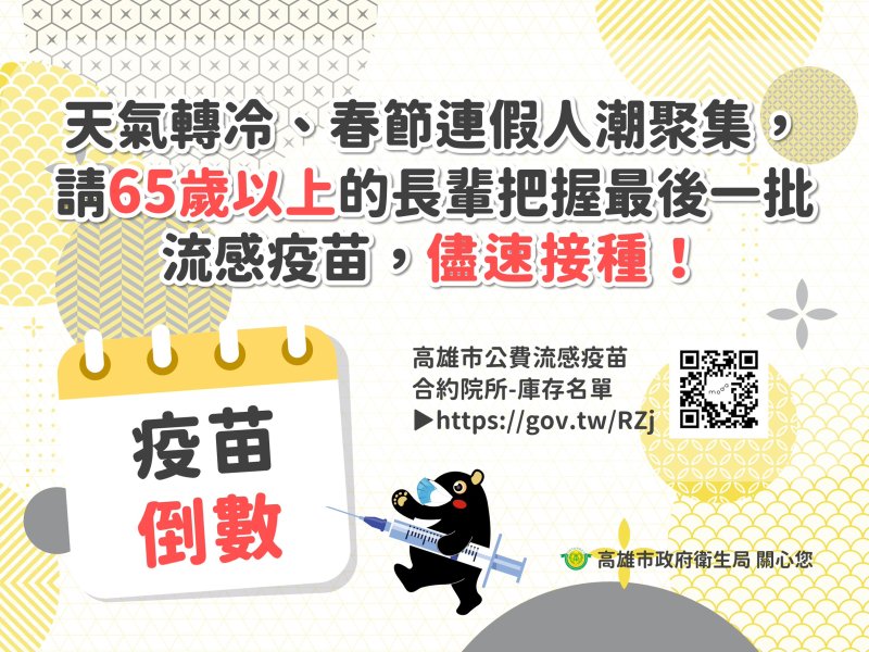 【漾新聞記者陳雯萍/高雄報導】農曆春節將至,返鄉與出遊人潮交織,天氣濕冷也讓流感與腹瀉等傳染風險升高。高雄市政府衛生局10日提醒,市內公費流感疫苗最後一批僅剩約一千劑,預估本週將用罄,呼籲長者、幼兒、慢性病患等高風險族群把握年前完成接種,以爭取完整保護力,安心迎接年節。