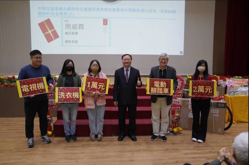 王政彥表示,本次新春團拜以實體與線上直播同步進行,向全校教職員生、退休同仁、校務顧問與校友拜年,也感謝各界贊助與各處室團隊分工合作,讓活動順利圓滿。特別肯定人事室主任李麗君、圖資處長余遠澤與公關執行長鄂見智率領團隊用心規劃與募集獎品,為全體同仁帶來溫馨又難忘的迎春時刻。