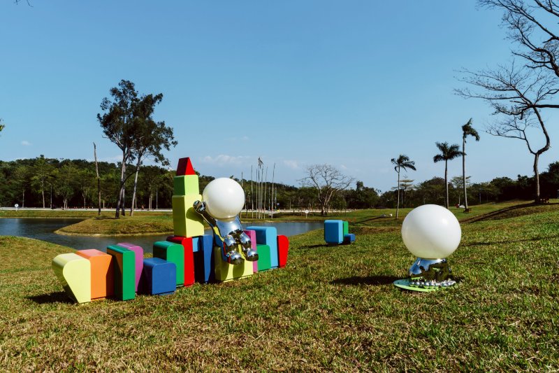 臺灣藝術家張騰遠以鳥瞰視角創作《鸚鵡模仿術-高爾夫球》,將高爾夫球放大近350倍,打造直徑12公尺的巨型裝置,背面隱藏其代表性的「鸚鵡人」臉龐,充滿幽默趣味。尹子潔則以桃花心木果實為靈感,打造《桃花果果開》、《菇菇屋》與《仙女圈》,宛如森林裡的祕密基地,吸引親子探索。