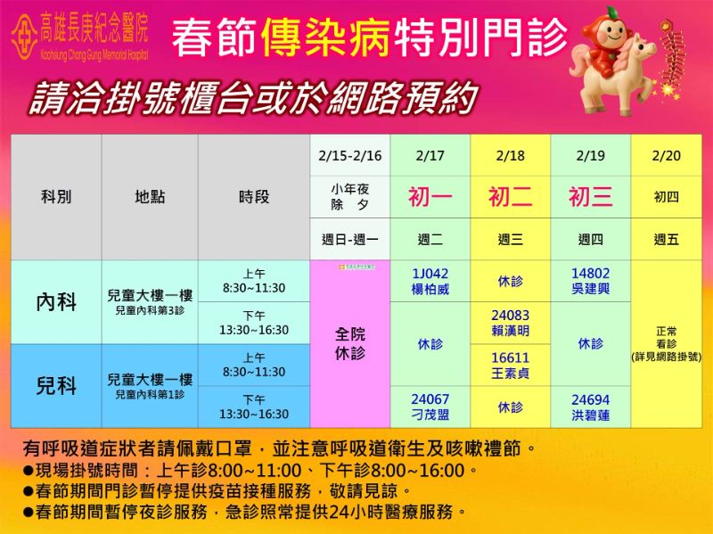 為因應春節防疫需求,三家醫院將於2月17日至2月19日開設「春節傳染病特別門診」,提供發燒或呼吸道症狀民眾預約就醫服務,2月20日起恢復正常門診。民眾可透過高雄長庚、大同醫院與鳳山醫院官網,或使用「長庚e指通」App查詢門診資訊,也可利用「健保快易通」App掌握即時急診動態,提前規劃就醫行程。