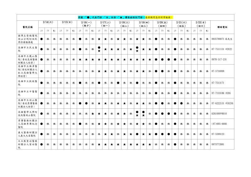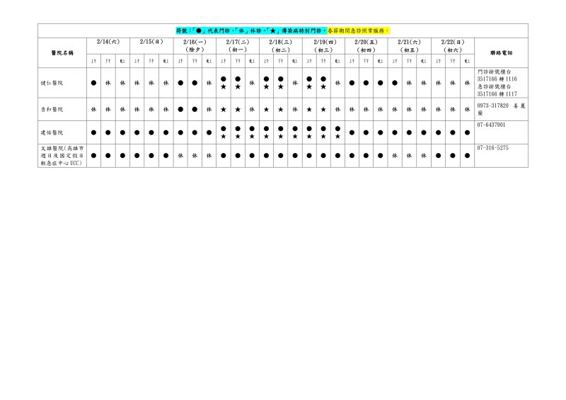 衛生局提醒,連假期間醫院急診維持正常運作,民眾如有醫療需求,可先查詢「本市急救責任醫院與市立醫院門診開設情形」一覽表,相關資訊已公布於高雄市政府衛生局網站首頁「最新消息」。此外,也可透過衛生局網站「雄貼心服務」中的醫療機構看診時段查詢功能,或使用衛生福利部中央健康保險署「全民健保行動快易通(APP)」的「春節院所服務查詢」,掌握即時開診資訊,減少奔波等待時間。