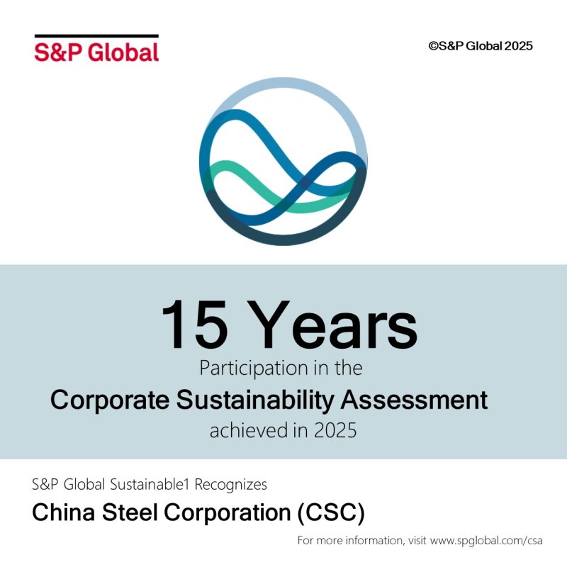 此次評比中,中鋼不僅躋身全球鋼鐵業前段班,也因連續15年參與S&P Global CSA評比,獲頒《參與S&P Global CSA 15週年》紀念徽章,象徵長期深耕永續發展的努力獲得國際肯定。S&P Global為全球具指標性的金融資訊與信用評級機構之一,2026年依據2025年CSA成績,從全球超過9,200家企業中遴選848家企業入列年鑑,中鋼在激烈競爭中再度脫穎而出。