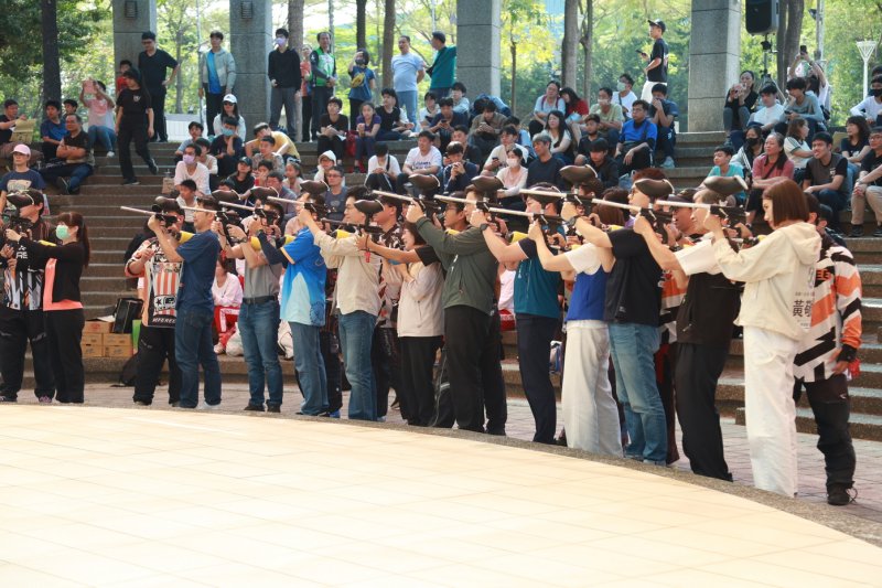 封面圖說:教育局長吳立森、立委賴瑞隆、議員陳麗娜、張博洋、館長黃昭誌等人持槍擊發開幕掀起活動高潮。(記者陳雯萍攝)