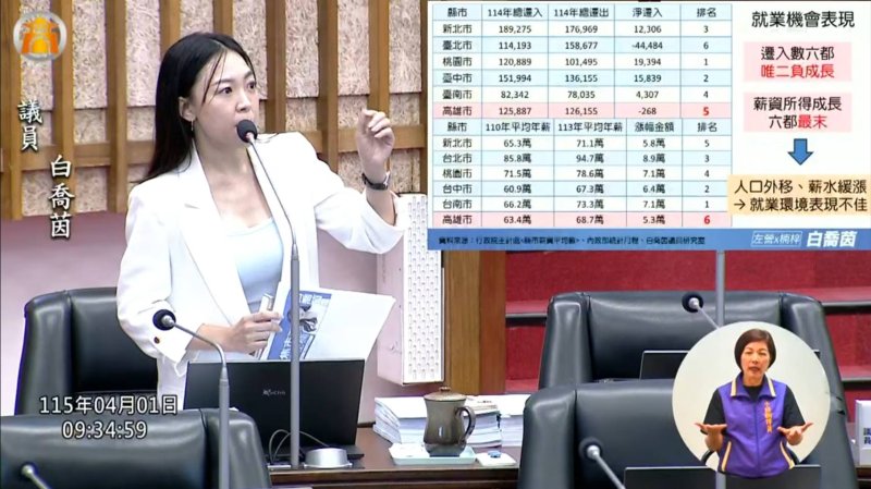 白喬茵則反擊表示,「我也拉出了中位數,我們去年排名第四,也不是你所謂的第二名,平均薪資都是比較末段班的。」她認為,知道市長很努力沒有錯,但還是要看實際的數據。可惜這些數字並沒有反應出一個很好的狀況,忚質疑市府團隊到底是不夠努力?還是努力錯方向了呢?「我相信您是夠努力的。」