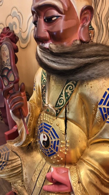 新神衣要換上,經上香請示聖諭,才知道太上老君道祖胸前有裂痕,於是緊急召開臨時會議,經會議共識需請對神明有經驗者協助,經轉傳缘至高雄三鳳宮董事長孫宗英虔誠指引,許能福道長經驗豐富可協助。