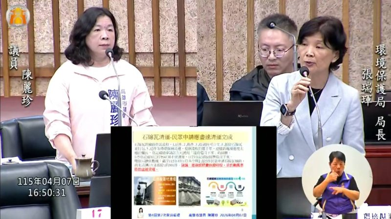 針對石綿瓦清運問題,陳麗珍指出,石綿瓦因含致癌物已於2018年全面禁用,目前高雄市仍有逾3萬噸待處理,多數須由市民自行拆除並打包後申請清運,但實務上清運流程冗長且經費疑似不足。她舉例,有案件於今年1月初申請,需至4月才能清運,亦有1月下旬申請,於3月23日詢問環保局,竟被告知經費已用罄,她質疑年度尚未過半即面臨資源不足問題。