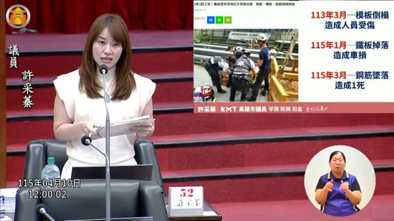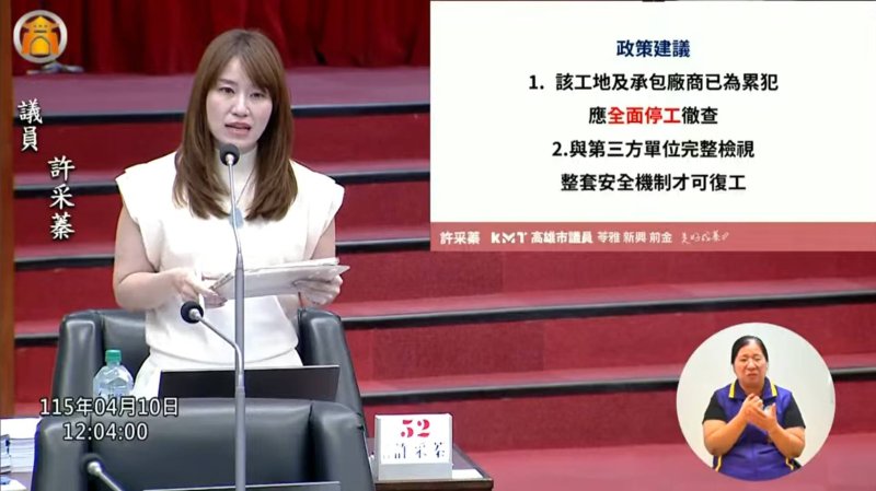 許采蓁指出,工安問題涉及勞工生命安全,不容忽視,要求市府應採取更嚴格措施,避免類似事件再度發生。她建議市府比照台中捷運工程及台北基泰大直案處理模式,針對宏昇營造在高雄承攬的所有工地進行全面清查,並在調查完成前實施停工。