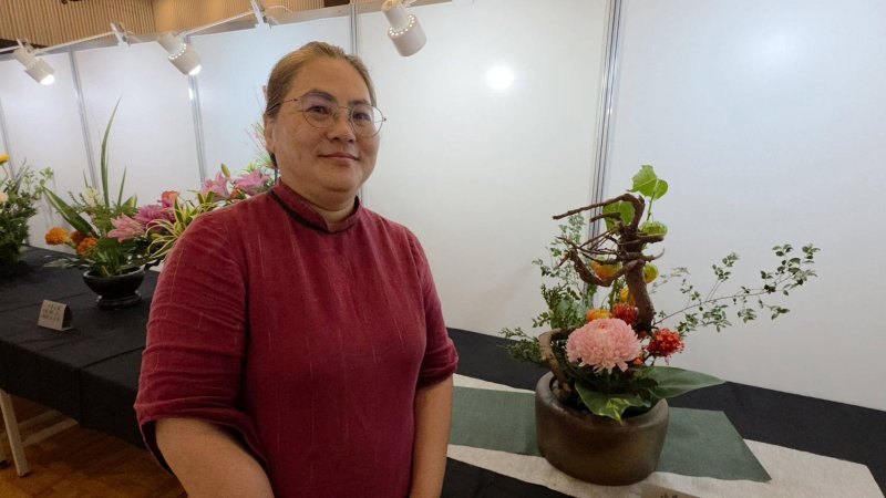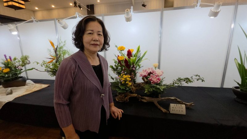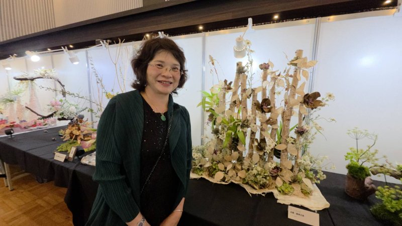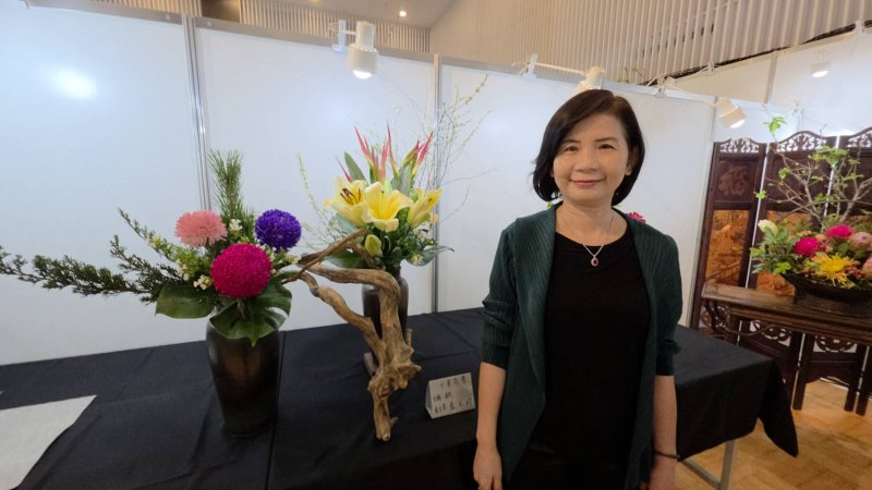 ▲會長王素惠則屬於日本小原流派的插花,本次以小原流的琳派調的花型創作,在展現秋、冬、春的季節變化。(漾新聞記者陳雯萍攝)