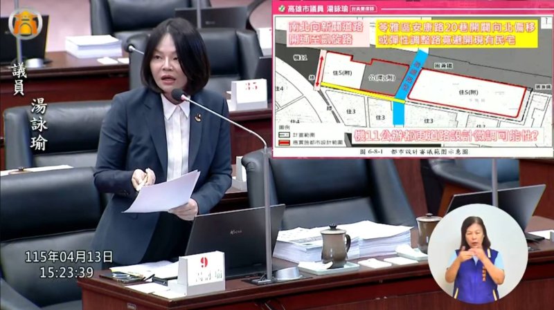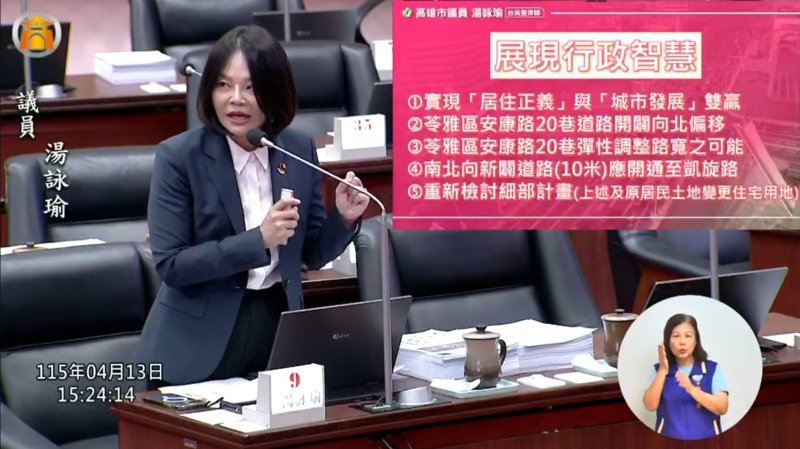 【漾新聞記者陳雯萍/高雄報導】高雄市議會今(13)日進行高雄市都市計畫委員會業務報告與質詢,議場火藥味濃厚。擁有台美雙律師身分,問政一向理性專業的高雄市議員湯詠瑜,今天相當罕見的動怒。她是針對苓雅區「機11」都市計畫變更及安康路20巷道路開闢案提出質詢,強調該案涉及5戶合法建物拆遷,要求市府審慎檢討路線與開闢必要性。不料在答詢過程中,副市長林欽榮一句回應引發誤解,讓湯詠瑜認為遭影射為「關說」,當場情緒激動反擊,議場一度陷入緊張對峙。