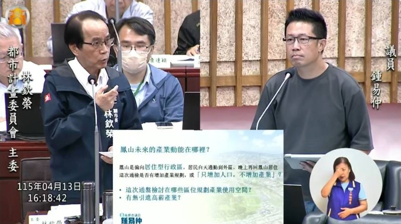 鍾易仲進一步指出,鳳山平均家戶所得約100萬元,不僅低於新竹市約150萬元,也不及基隆市與宜蘭縣約110萬元的水準,顯示人口規模與經濟發展存在落差。他呼籲市府應在都市計畫中規劃產業用地,引進具發展潛力的產業,讓居民能在地就業、在地生活,打造真正完整的城市機能。