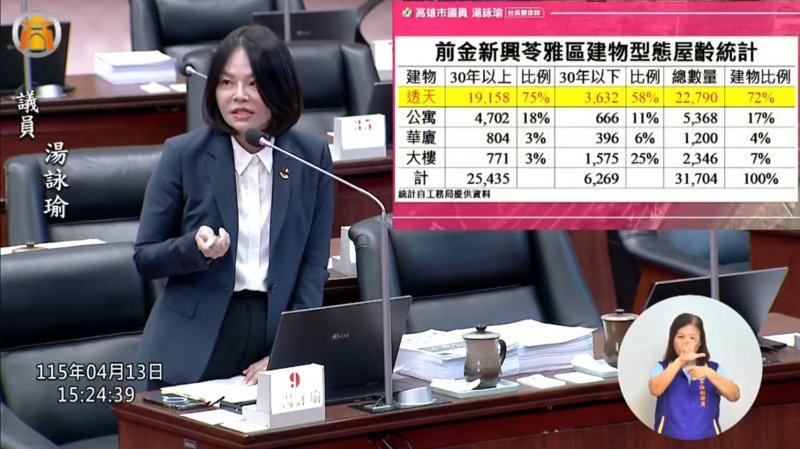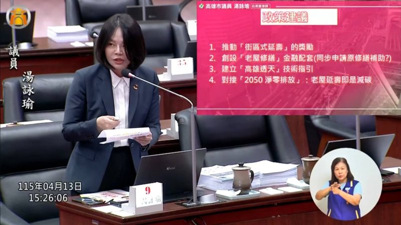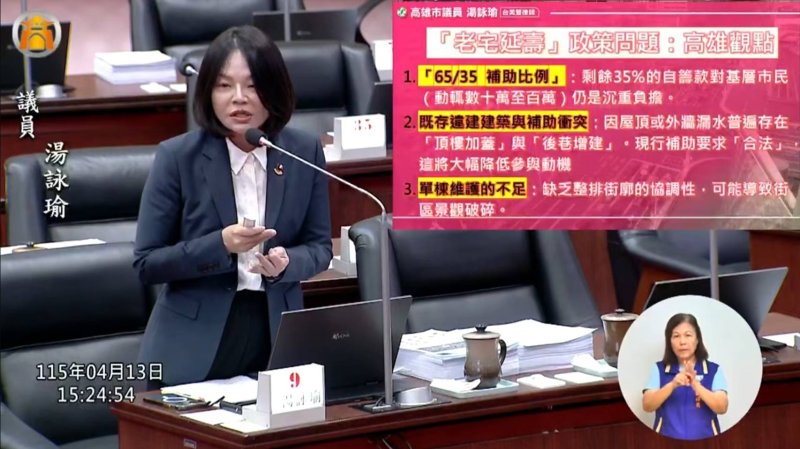 【漾新聞記者陳雯萍/高雄報導】高雄市議會今(13)日進行高雄市都市計畫委員會業務報告與質詢,高雄市議員湯詠瑜針對即將於5月上路的「老宅延壽」政策提出質疑,指出高雄擁有約28萬棟老屋,其中透天比例高達八成,若補助機制未能貼近實際需求,恐讓政策美意難以落實,甚至加劇弱勢住戶的負擔。