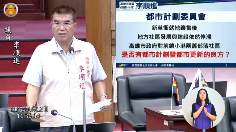 【漾新聞記者陳雯萍/高雄報導】高雄市議會今(13)日進行高雄市都市計畫委員會業務報告與質詢,高雄市議員李順進再度為小港、前鎮發聲,痛批城市發展失衡「只見新人笑,不見舊人哭」,並進一步要求將「高雄國際機場小汽機車地下道」納入航站更新二期工程,呼籲市府都市計畫應先期配合,避免重大建設與地方需求脫節。