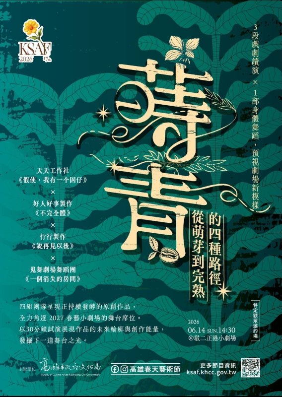 今年亦首度推出創作匯演《蒔青:從萌芽到完熟的四種路徑》,集結天天工作社、行行製作、好人好事製作與嵬舞劇場舞蹈團四組創作力量,透過讀演與身體展演交錯呈現,展現作品從萌芽到成形的生成軌跡。活動同時邀請大專院校表演藝術學生參與觀摩與評論,讓劇場不只是觀看場域,更成為知識與創作交會的學習現場。