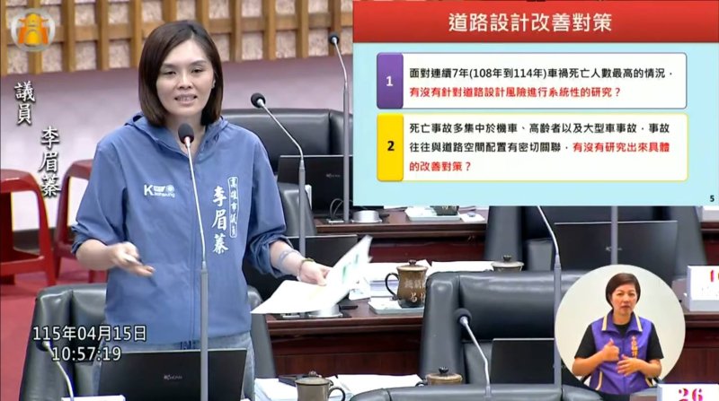 【漾新聞記者陳雯萍/高雄報導】高雄市議會民政部門質詢15日持續聚焦民眾最切身的安全議題。高雄市議員李眉蓁直指,高雄市交通事故死亡人數已連續7年居全國之冠,最新統計死亡307人,平均每28小時就有1名市民因車禍喪命,數字怵目驚心,令人難以接受。她質疑,市府年年檢討、年年公布危險路段,但死亡數字仍高居不下,研考會若僅止於統計與公布,而未深入提出道路風險研究與改善建議,等同束手無策,難以回應市民對宜居城市的期待。