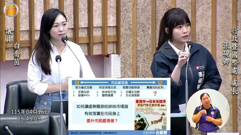 白喬茵指出,行政暨國際處肩負高雄城市外交重任,市府每年投入數千萬元經費推動國際交流,然而究竟要如何衡量成效,不能只看互訪次數與簽署數量,更要檢視市民是否感受到國際交流帶來的具體效益。她說,市府常以「深化跨領域連結」、「鞏固夥伴關係」、「提升城市能見度」作為成果說明,但這些文字過於抽象,若無法對應到市民生活,就難以說服社會。