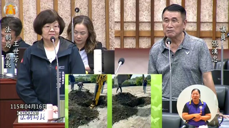 張漢忠在議場播放現場影像,質疑從開挖畫面來看,土層內未見明顯廢棄物,但表層卻被認定為混有垃圾,標準認定不一。他表示,民眾購買土方時未必具備專業辨識能力,若供應來源有問題,責任不應全由地主承擔,政府應從源頭管理與查核,而非直接將風險轉嫁給民眾。