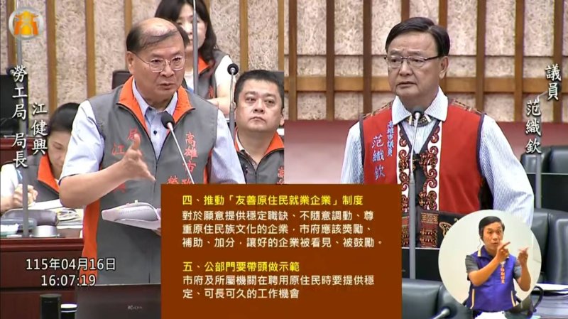 范織欽質詢一開始,先肯定高雄市政府勞工局近期在多起原住民族勞資糾紛中協助調解成立,並特別點名承辦同仁表現積極,讓許多到服務處求助的族人得以獲得實質協助。不過他隨即指出,個案背後反映的是更深層的結構問題,尤其原住民族勞工多集中於基層工作,處境本就弱勢,若欠缺制度保護,面對雇主時往往只能忍氣吞聲。