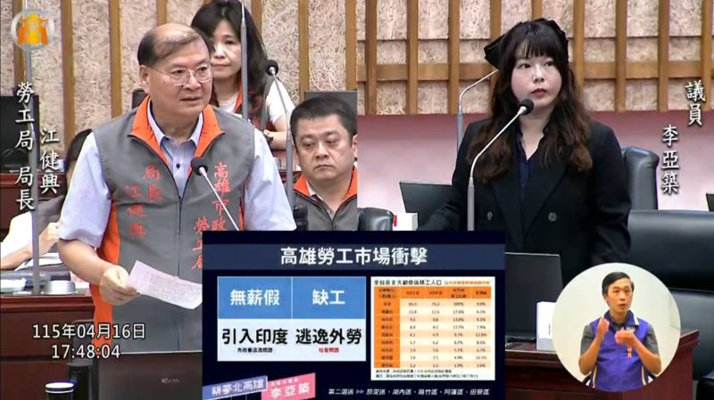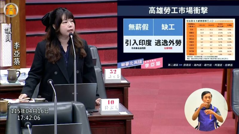 最後,李亞築再回到勞工議題,關切外籍移工、無薪假、職災與工安風險等問題,要求高雄市政府勞工局加強管理與查核。高雄市政府勞工局長江健興表示,印度移工引進仍屬中央政策,目前尚未正式實施;至於工安案件,勞工局將持續加強勞檢與高風險作業查察,避免重大職災一再發生。