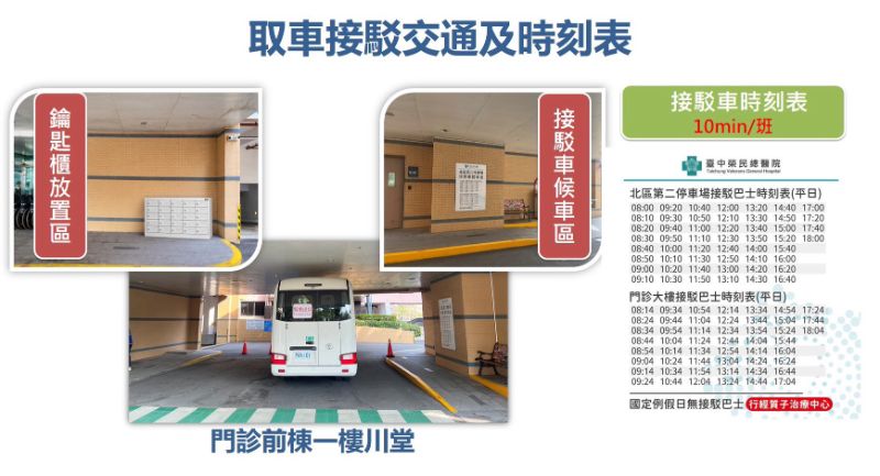 依規劃,代客泊車服務時間為平日上午8時至下午4時,服務地點設於第一醫療大樓及門診前棟大樓一樓入口處。民眾抵達後可由專人協助停車,車輛將停放於北區停車場,單程代駕服務費為100元,停車費另計。