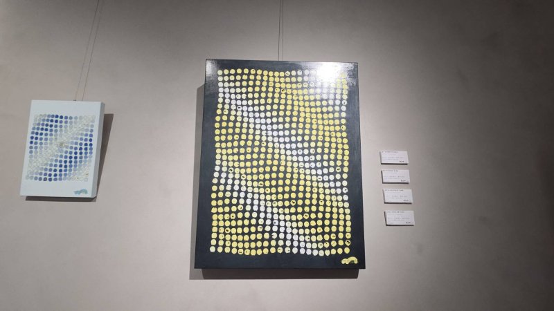 而同樣位於展場大廳的另一幅作品,則透過不同色澤的點點進行有序排列,從淺色逐漸過渡至深色,層層堆疊出一種細膩且富節奏感的流動視覺。這種由色彩深淺所引導的變化,不僅讓畫面產生如波動般的律動,也進一步為畫作注入時間推移的感受,使靜態的平面呈現出彷彿流轉不息的動態張力,整體畫面在秩序與變化之間取得平衡,展現出豐富的空間層次與無盡的想像空間。