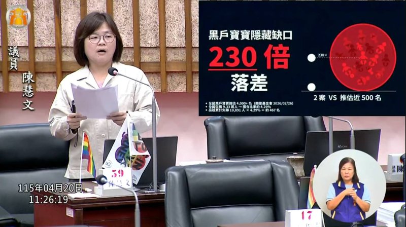 她進一步指出,失聯移工問題不只牽涉勞動管理,更會衍生黑戶寶寶等更深層的人權議題。所謂黑戶寶寶,就是失聯移工在台所生子女,因身分未明,可能沒有國籍、戶籍、健保、疫苗紀錄與就學資料。陳慧文表示,過去社會局答詢曾提到目前列管黑戶寶寶僅2案,但若依民間關愛基金會統計,全國約有4000名黑戶寶寶,以高雄1萬多名失聯移工換算,推估高雄可能有467名黑戶寶寶,與現有列管數字落差極大,顯示仍有大量黑數隱身社會角落。