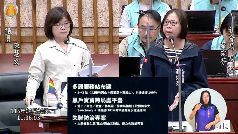 【漾新聞記者陳雯萍/高雄報導】高雄市議會今(20)日進行社政部門業務質詢,市議員陳慧文聚焦失聯移工、黑戶寶寶、多語服務、銀髮家園與鳳山公托量能等議題,直指高雄面對移工失聯與弱勢兒少隱形化問題,不能再被動等待個案浮現,市府應主動建構更完整的服務與預警機制,把藏在城市角落的風險與需求找出來、接住來。