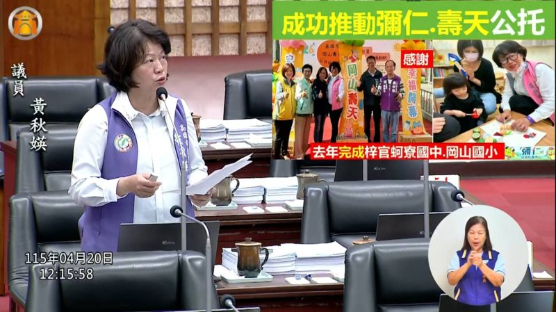 黃秋媖最後也反映,北高雄部分社區因歷史因素存在建物無使用執照問題,導致社區關懷據點與公共空間修繕補助受限,影響長輩安全。她以彌陀文安社區為例指出,長輩在無安全保障的空間用餐令人憂心,建議市府檢討補助規範,提升彈性,兼顧安全與實務需求。