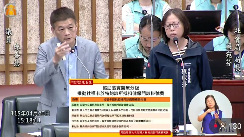 在醫療使用範圍方面,陳善慧認為,目前僅開放市立醫院與衛生所掛號費可折抵,仍嫌不足,建議比照台中、彰化等縣市,將轄內更多特約診所納入,讓長輩在日常就醫上有更實質幫助。蔡宛芬回應,現階段已先參考六都做法,考量高雄財政負擔與執行量能,優先從市立醫院與衛生所開始,未來若整體財務與系統建置可行,將再評估第二階段擴大開放。