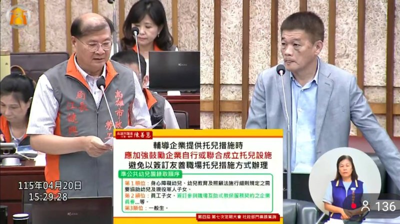最後,陳善慧將焦點轉向企業托育,認為勞工局應更積極輔導企業自行或聯合設置托兒措施,打造真正友善職場。他指出,若企業未設托育設施,員工孩子就只能與一般民眾一起競逐外部公托名額,容易造成排擠與不足,建議勞工局應主動鼓勵轄內大型企業設置托嬰、托兒空間或委外合作,減輕職場家庭負擔。