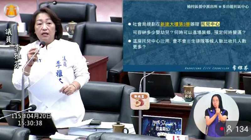 【漾新聞記者陳雯萍/高雄報導】高雄市議會今(20)日進行社政部門業務質詢,市議員李雅芬聚焦北高雄托育量能、公共托嬰排隊壓力,以及企業托兒設施設置不足等議題,直言高雄雖然近年公共托育據點明顯成長,但面對雙薪家庭與少子化雙重壓力,托育資源仍供不應求。她要求市府加速公托布建、提高補助誘因,並主動輔導大型企業設置托兒設施,減輕年輕家庭負擔。