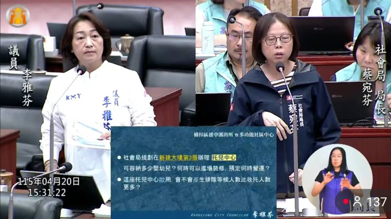 李雅芬首先追蹤高雄大學特定區多功能活動中心與新建派出所共構案。她指出,這項她自109年以來持續關心的建設,未來其中1個樓層將由高雄市政府社會局規劃設置托兒中心,外界高度關注進度。對此,社會局長蔡宛芬答詢表示,目前社會局已先與廠商接洽,只要新工處辦理部分點交,就會同步進場施作內裝,不會等整棟完工後才啟動,將採雙軌進行方式加速辦理。