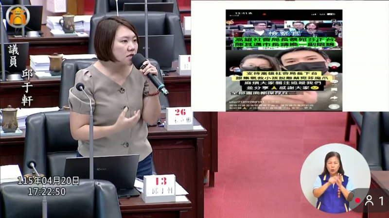 【漾新聞記者陳雯萍/高雄報導】高雄市議會今(20)日進行社政部門質詢,市議員邱于軒針對一起受虐兒安置後,家長持續在網路發布影片、質疑社會局處置程序一事提出質詢,要求高雄市政府社會局長蔡宛芬不要再只是由第一線社工單獨提告,而應代表高雄市社會局正面回擊,以具體法律行動捍衛社工尊嚴與機關公信力,避免錯假訊息持續發酵,讓社會對兒少安置制度產生混亂與誤解。