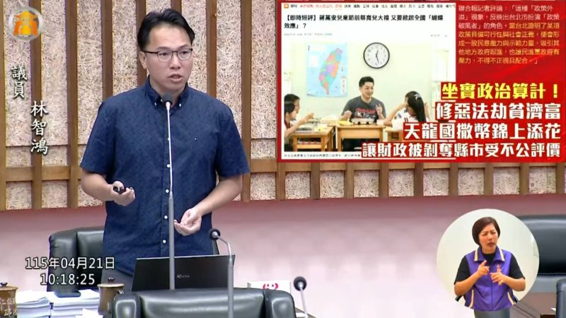 【漾新聞記者陳雯萍/高雄報導】高雄市議員林智鴻今(21)日於市議會財經部門質詢時指出,近期財劃法修正與中央總預算爭議,已使地方財政分配出現明顯落差,形成「肥台北、瘦高雄」的不均現象。他直指相關政策導致社福資源差距擴大,並批評政治操作凌駕公共利益,要求市府儘速盤點衝擊並提出因應對策。