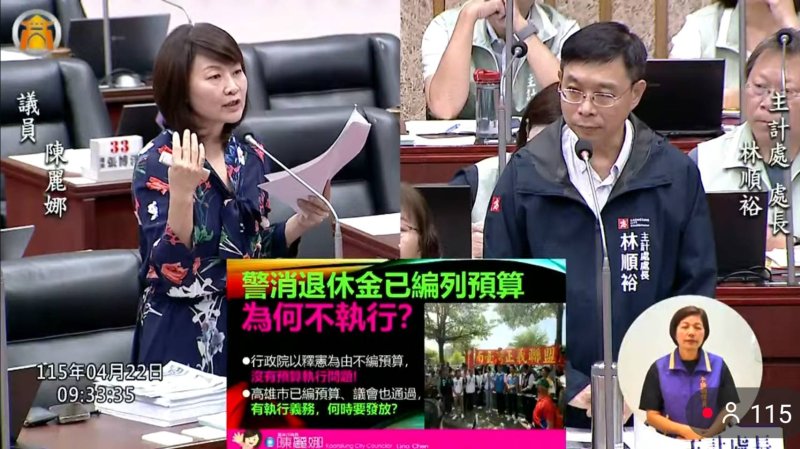 此外,針對警消退休制度調整,陳麗娜指出中央已完成三讀並公告,市議會亦編列4.16億元預算,但市府尚未發放,質疑是否行政怠惰。