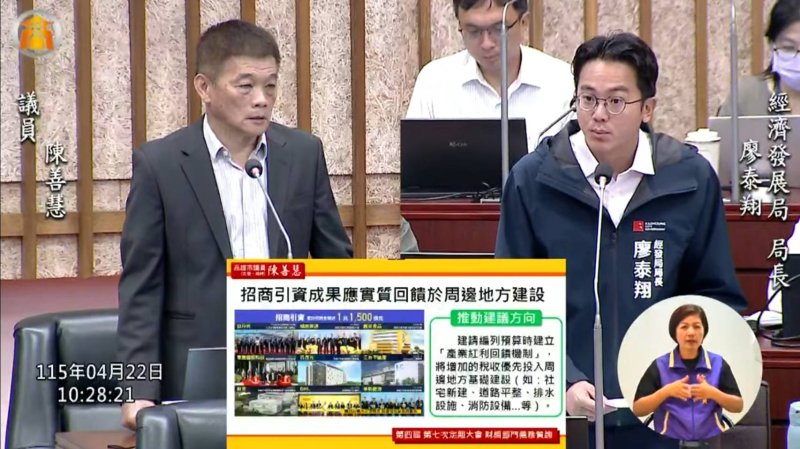 經濟發展局長廖泰翔表示,企業投資確實帶動地方經濟與稅收成長,未來將與財政局研議回饋機制可行性。他指出,目前市府已透過促進產業發展補助,引導企業投入在地回饋,例如提供獎助學金、優先聘用在地居民等,未來也將鼓勵企業擴大社會責任投入。