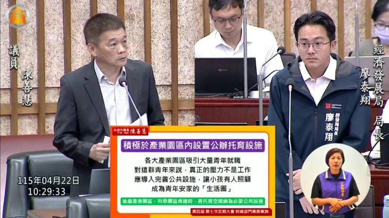此外,陳善慧關心產業園區托育設施不足問題,指出園區大量青年就業人口面臨育兒壓力,建議聯合幾家企業設置公共托育與幼兒園。廖泰翔回應,目前楠梓科技產業園區及科學園區已有設置相關托育設施,未來新設園區如仁武產業園區,將於服務中心周邊規劃公托與公幼空間,並由市府提供建物與社會局合作營運。