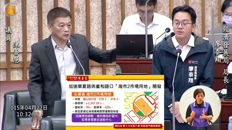 針對灣市2市場用地開發爭議,陳善慧指出地方居民需求未充分整合,導致招商過程反覆受阻。廖泰翔表示,預計今年7月1日完成用地分割,後續將召開公聽會,蒐集地方意見後再進行招標作業,避免重蹈溝通不足覆轍。