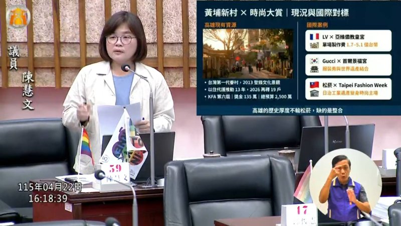 【漾新聞記者陳雯萍/高雄報導】高雄市議會今(22)日財政部門質詢中,高雄市議員陳慧文將焦點轉向青年與文化發展,力推將「KFA高雄時尚大賞」決賽移師鳳山黃埔新村,打造結合歷史場域與時尚創作的新舞台,並進一步擴大鳳山青年空間布局,為城市注入更多創意動能。