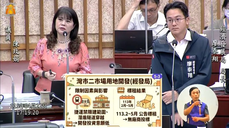 對於崇實市場活化案,陳玫娟則表達肯定。她指出,該案目前已完成動土,興建計畫大致底定,預估工期4年,營運期46年,投資金額超過7億元,基地規模將興建地下2層、地上6層建築。她也要求市府持續提供書面進度資料,讓議會與地方同步掌握開發進展。