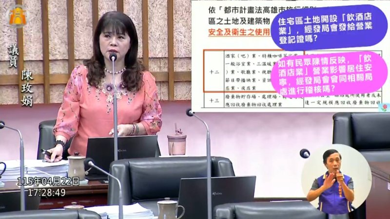 質詢尾聲,陳玫娟將矛頭指向住宅區餐酒館擾民問題。她指出,依《高雄市都市計畫法施行細則》,住宅區應以住宅及不妨礙居住安寧、安全、衛生的使用為主,但部分餐酒館實際營運型態卻宛如夜店,深夜噪音擾人,居民長期陳情不斷。她質疑,經發局發給營業登記後,若實際使用已違反都市計畫分區與居住安寧,市府是否應主動會同都發、警察、環保等單位展開聯合稽查。