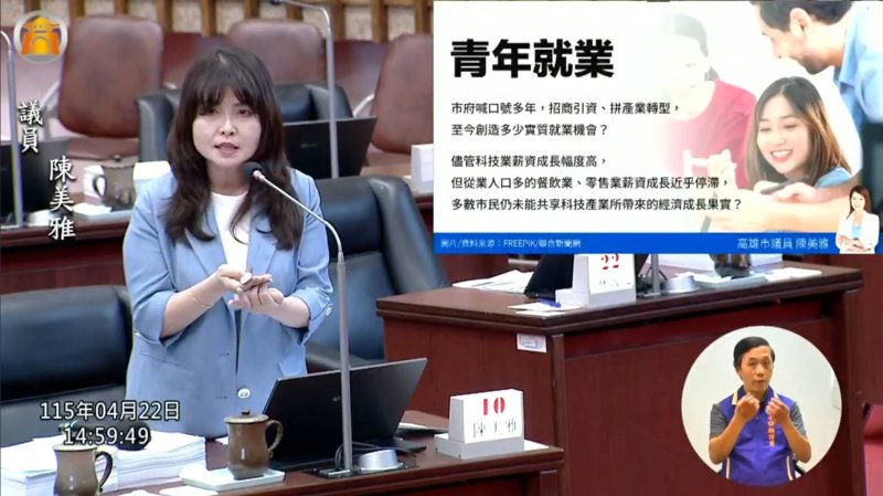 在就業面向,陳美雅指出,市府宣稱半導體等產業可創造10萬個就業機會,但目前青年仍面臨低薪與發展受限問題,25至29歲失業率仍居六都低段班,且起薪雖高於台中、台南,但仍落後雙北與桃園,呼籲市府提升薪資與就業品質。