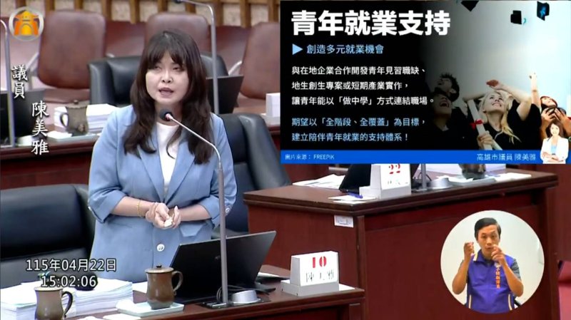 此外,陳美雅關切實習與就業銜接問題,指出許多青年畢業後仍處於失業狀態,要求市府強化實習轉正職機制,並與企業合作提供見習、創生專案與短期實作機會,建立完整就業支持體系。