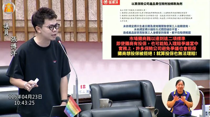 【漾新聞記者陳雯萍/高雄報導】高雄市正義市場日前爆發春捲食物中毒事件,造成上百人就醫,引發社會對基層食安防護的高度關注。高雄市議員張博洋於4月23日財經部門質詢中直指問題核心,指出多數攤商未投保產品責任險,一旦發生事故恐面臨高額賠償與求償無門的雙重風險,更揭露現行制度存在「想投保被拒、投保後恐不理賠」的結構性困境,要求市府正視漏洞,補強食安防護網。
