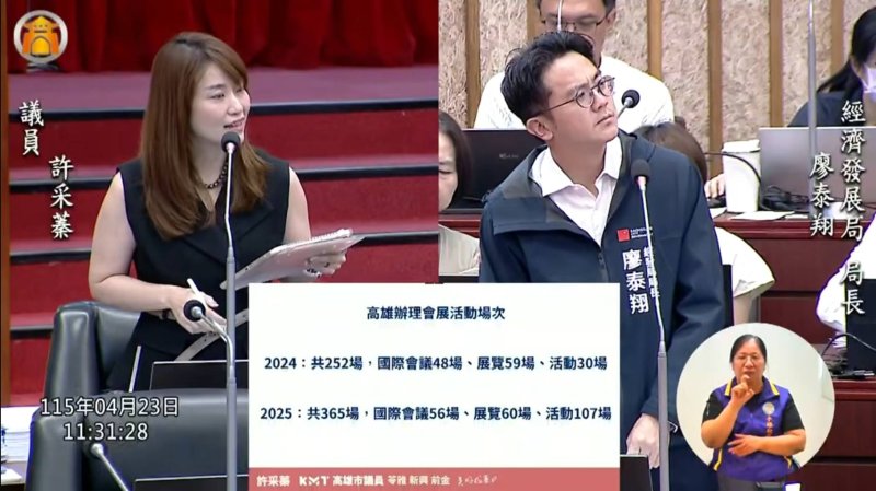 許采蓁進一步指出,活動數量從前年的30場暴增至107場,並質疑市府將內門宋江陣、春天藝術節等原本就存在的活動納入會展統計,形同「灌水KPI」。她認為,會展政策應聚焦國際會議與展覽,而非把地方活動納入統計,以免誤導政策方向。