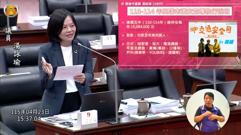 她指出,高雄市交通安全宣導預算約1500多萬元,既然有這樣的資源,應考慮調整部分經費配置,導入類似日本的真人實境展演模式。她認為,可依不同受眾設計不同內容,例如學生可與教育局合作,長者可與社會局合作,甚至結合文化局邀請專業表演團體設計情境式展演,將道安教育變成可感、可看的公共行動。